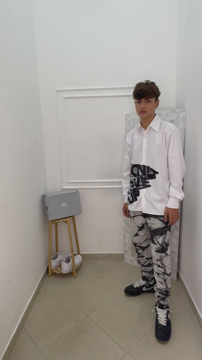 La camicia si presenta over, sul fronte riporta una scritta sul retro semplice: