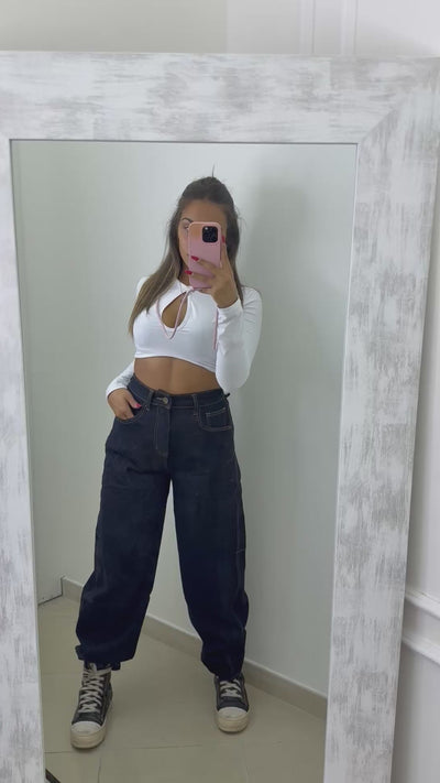 Vestibilità ballon la modella è alta 1.61 pesa 54 kg e indossa la taglia M.